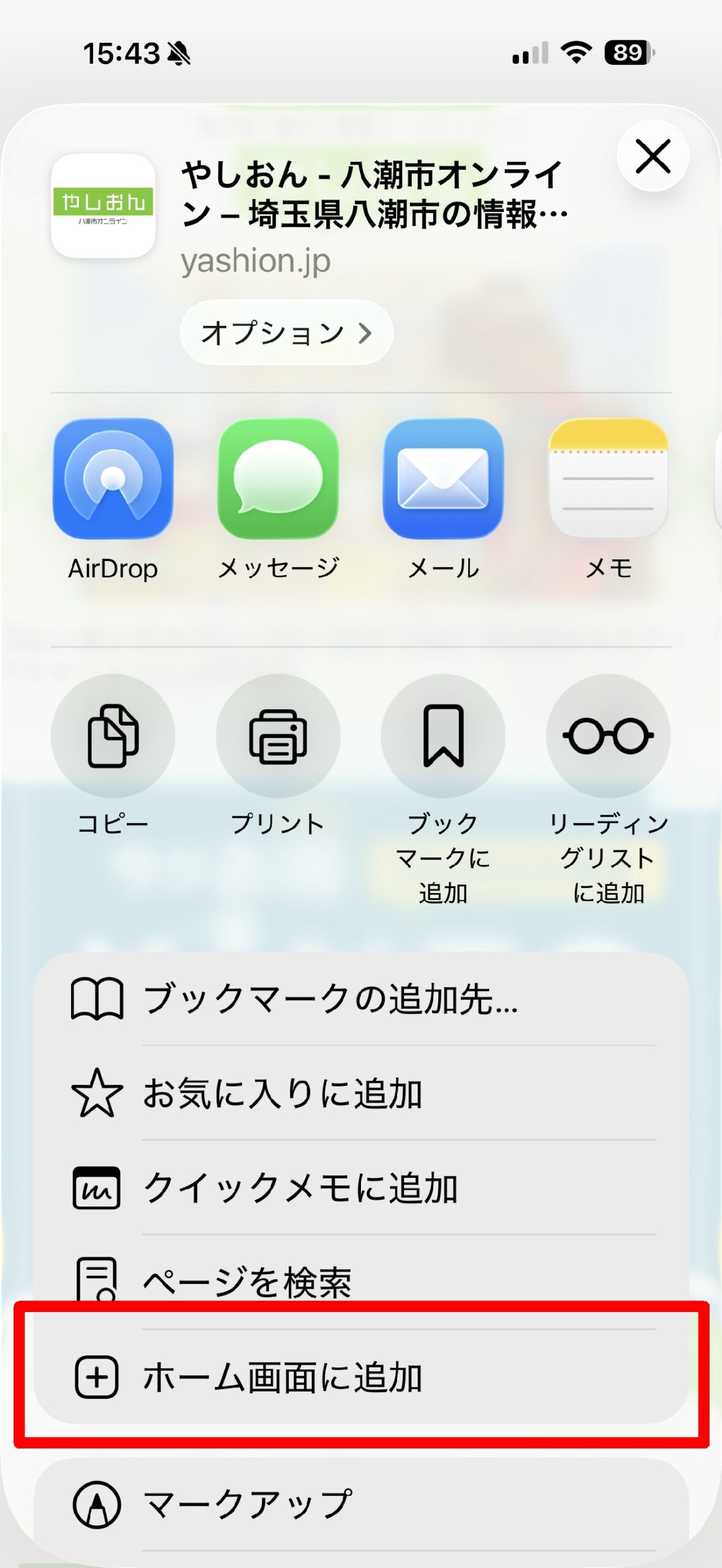 八潮市や近隣の地域情報を発信している「やしおん」も、そのひとつ。毎回Safariを開いて検索したり、ブックマークから探したりするのは、意外と手間がかかるものです。頻繁に訪れるサイトであれば、ホーム画面に置いておくとぐっと便利になります。
