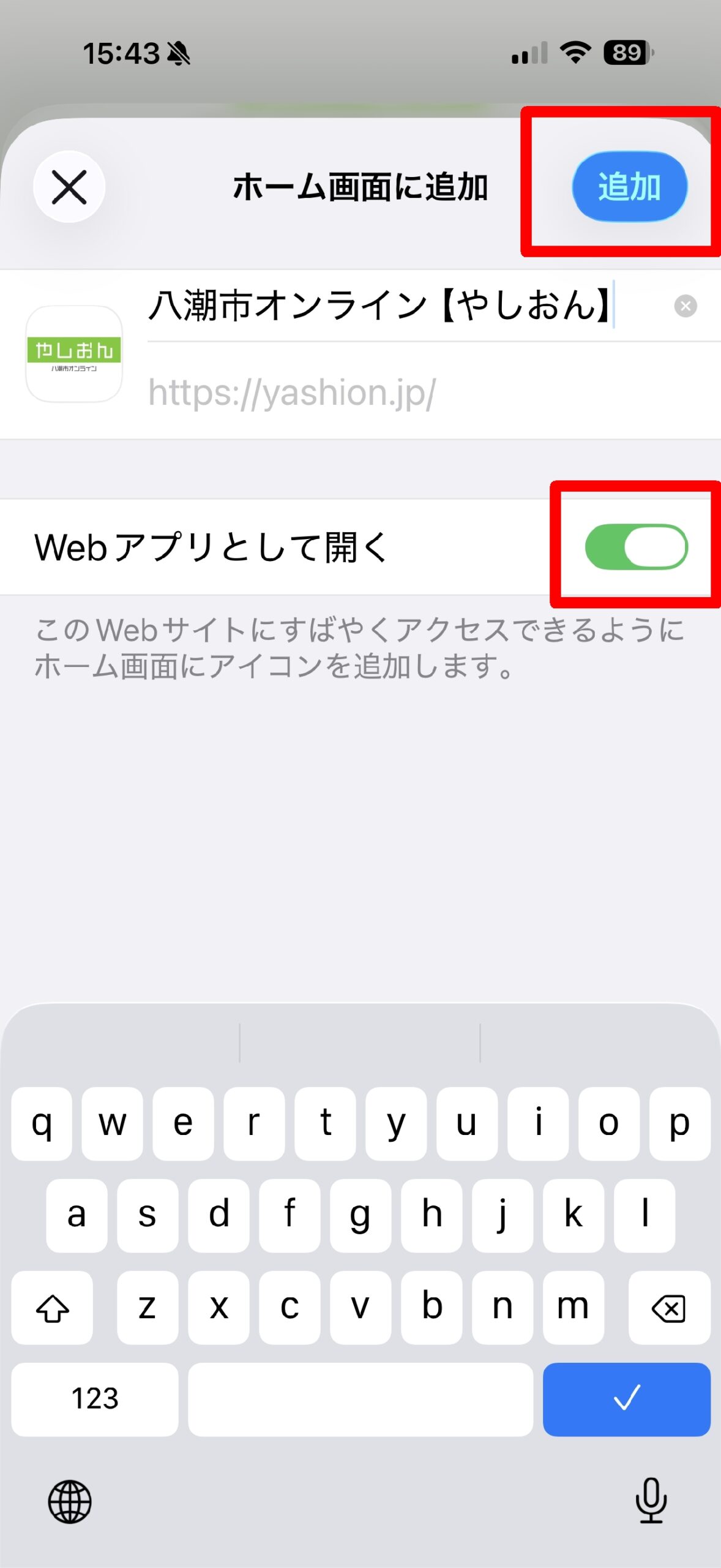 方法はとてもシンプルです。まずSafariで「やしおん」のWebページを開き、画面下にある共有メニューをタップします。表示された一覧の中から「ホーム画面に追加」を選択すると、確認画面が表示されます。このとき「Webアプリとして開く」というスイッチが表示される場合は、オンにするかどうかを選べます。