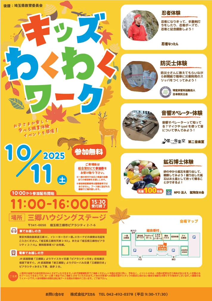 三郷市の「三郷ハウジングステージ」(埼玉県三郷市ピアラシティ2-7-6)にて、2025年10月11日(土)に子ども向け体験イベント「キッズ!わくわくワーク」が開催されます。時間は11時から16時まで(受付終了は15時30分)、参加は無料です。