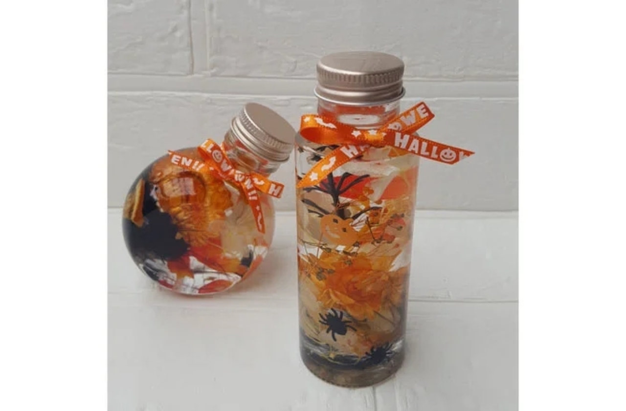 カラフルなアイテムを自由に組み合わせ、ハロウィン風にアレンジできるハーバリウムづくり。おしゃれで幻想的な作品を作り、思い出に残る一品となります。