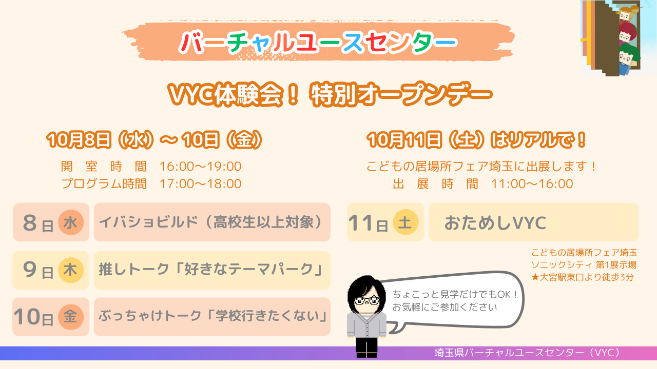 10月11日(土)には、さいたま市大宮区のソニックシティ第1展示場で開催される「こどもの居場所フェア埼玉」に出展します。会場ではタブレットを操作しながらバーチャル空間を体験できるほか、自宅などからスマートフォンやパソコンを通じて参加することもできます。