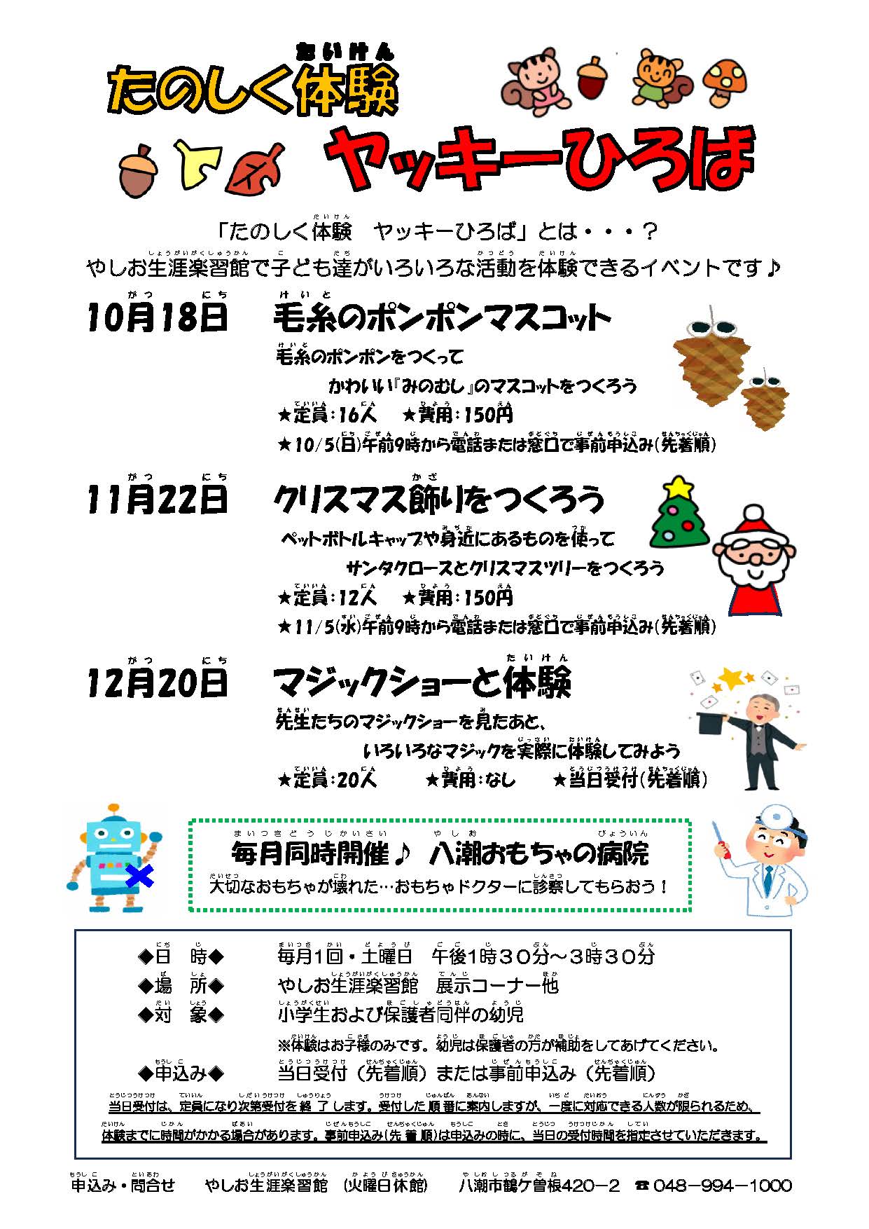 「ヤッキーひろば」は、子どもたちが身近な素材を使って工作や体験活動を楽しめる人気イベントです。小学生や保護者同伴の幼児が対象で、毎月さまざまなテーマが登場します。11月には「クリスマス飾りをつくろう」、12月には「マジックショーと体験」なども予定されています。