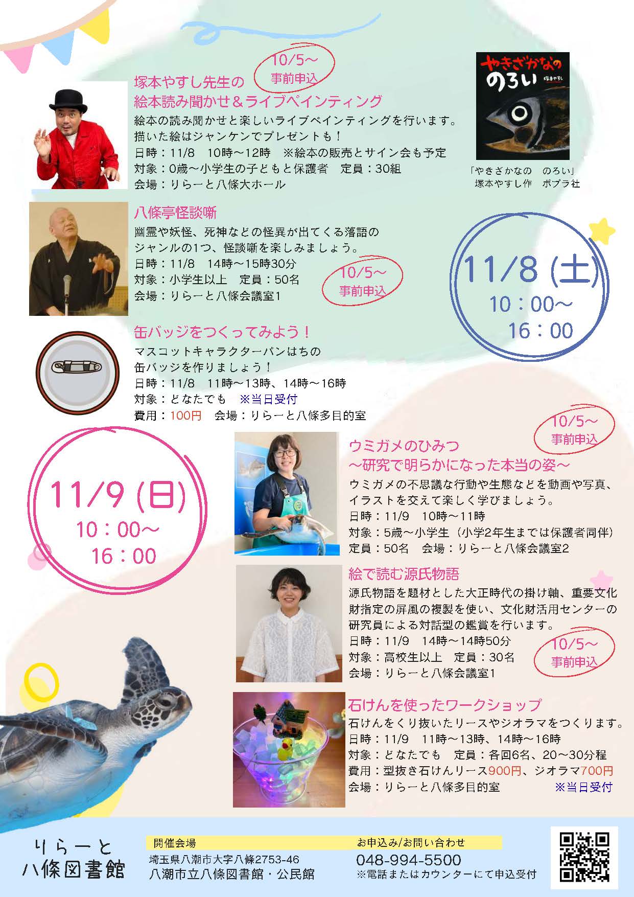 開催時間はいずれも10時~16時。申込が必要なプログラムは10月5日から八條図書館カウンターまたは電話(048-994-5500)にて受付しています。