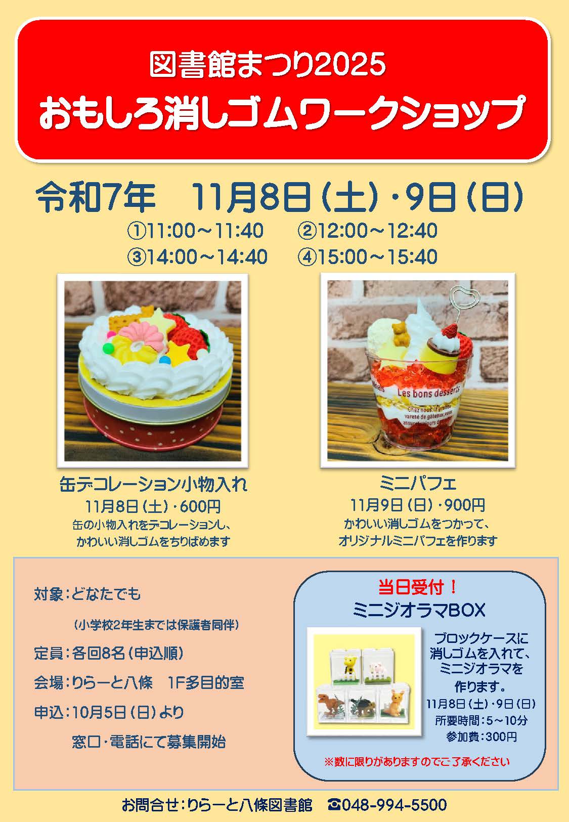両日ともに開催される人気企画「おもしろ消しゴムワークショップ」では、かわいらしい消しゴムを使った創作体験を楽しめます。
