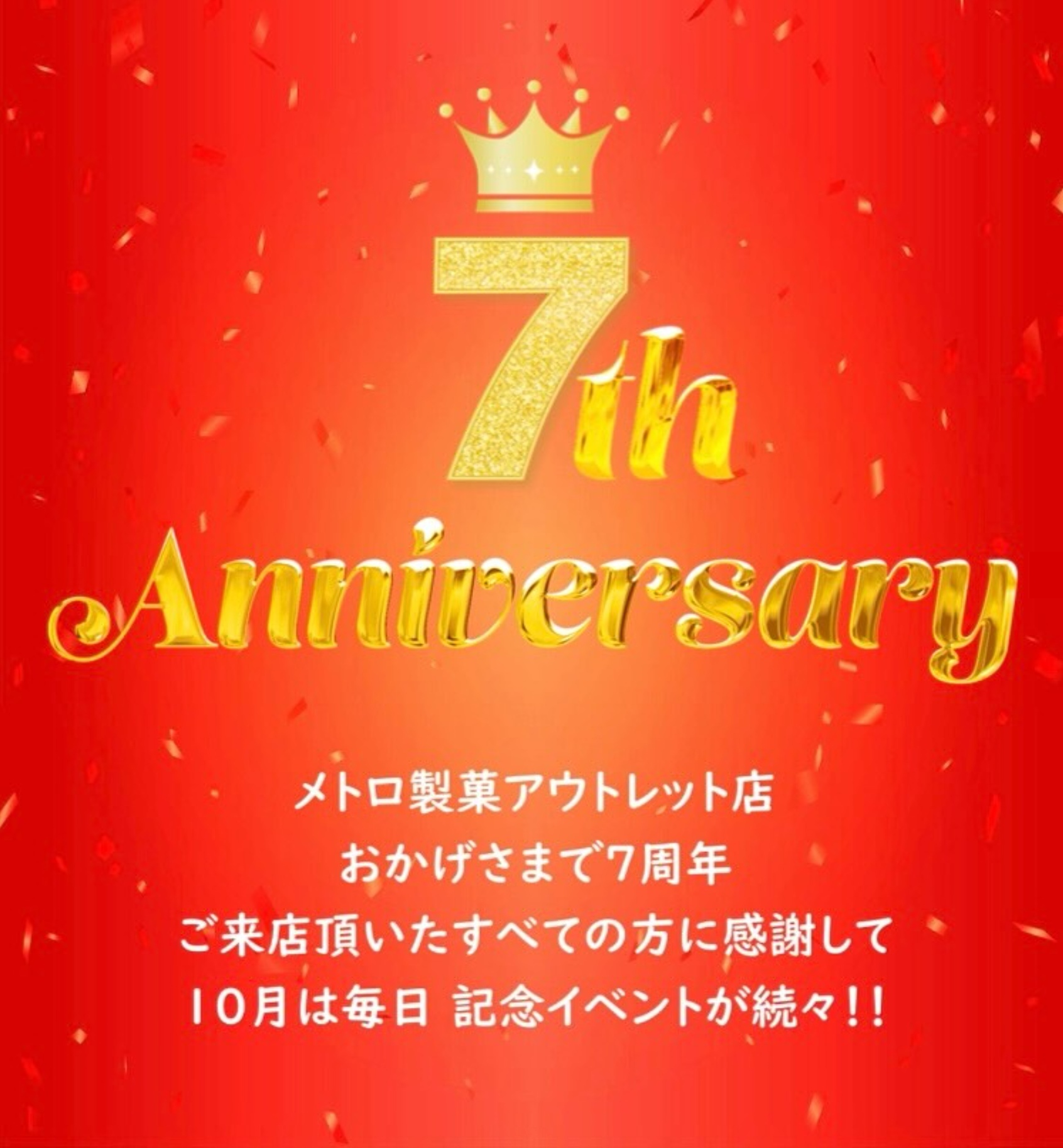 7周年を迎えたこの10月、感謝の気持ちを込めた特別なイベントが続くメトロ製菓アウトレット店。お得なセールや楽しいキャンペーンが揃うこの機会に、ぜひ足を運んでみてはいかがでしょうか。