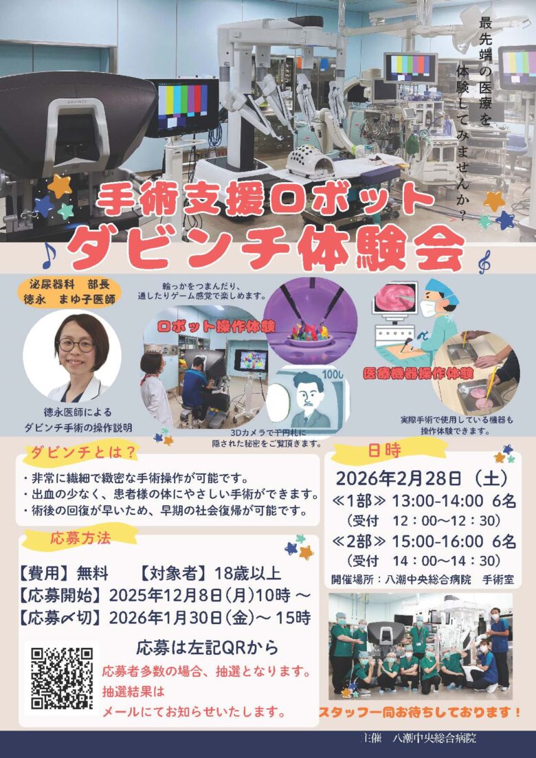 八潮中央総合病院は、2026年2月28日(土)に「手術支援ロボット ダビンチ体験会」を開催します。高度な医療技術を地域の方々にも知ってもらう機会として企画されたもので、実際の手術で使用されているダビンチの操作を体験できる貴重なイベントです。