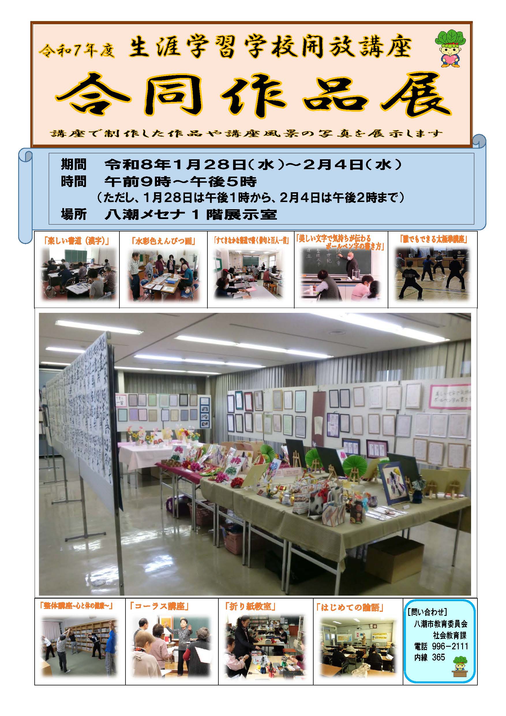 八潮市では、市内の小学校・中学校で実施された生涯学習学校開放講座の成果を紹介する「令和7年度生涯学習学校開放講座合同作品展」を開催します。