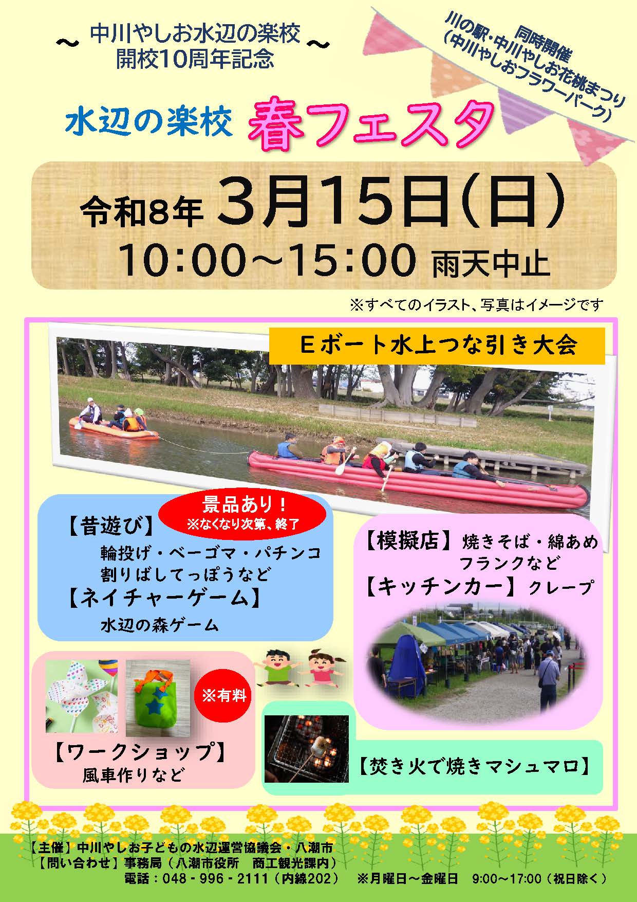 中川やしお水辺の楽校で、開校10周年を記念した「水辺の楽校 春フェスタ」が、3月15日(日)に開催されます。時間は午前10時から午後3時まで。雨天の場合は中止となります。