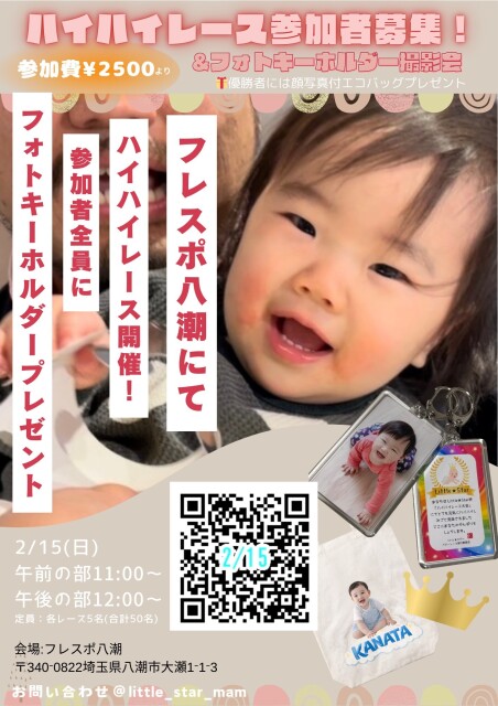 赤ちゃんの今しか見られない姿を、思い出として残せるイベントが、2月15日(日)にフレスポ八潮で開催されます。当日は、注目を集めている「ハイハイレース」と、フォトキーホルダーの撮影会が同時に行われます。