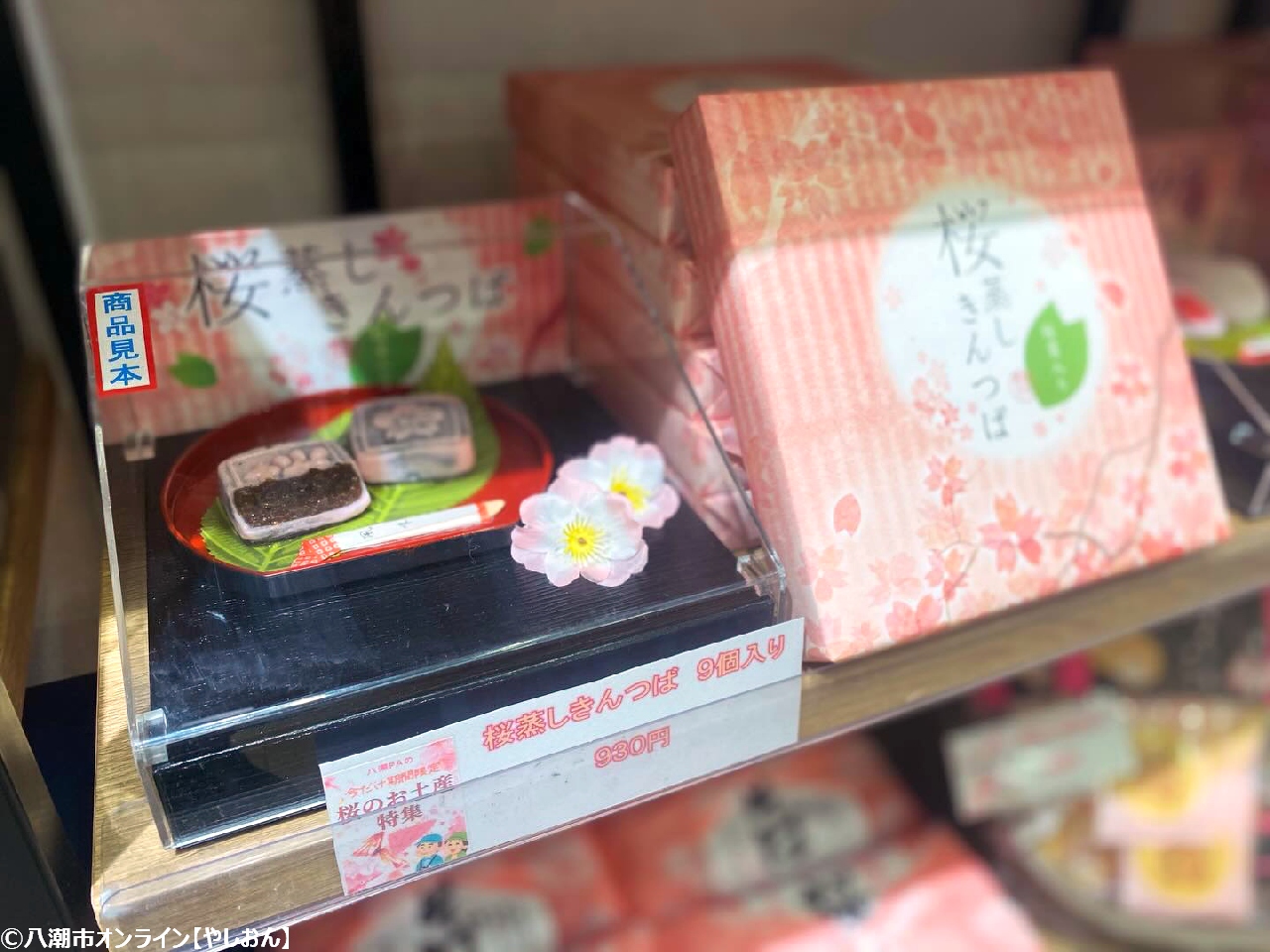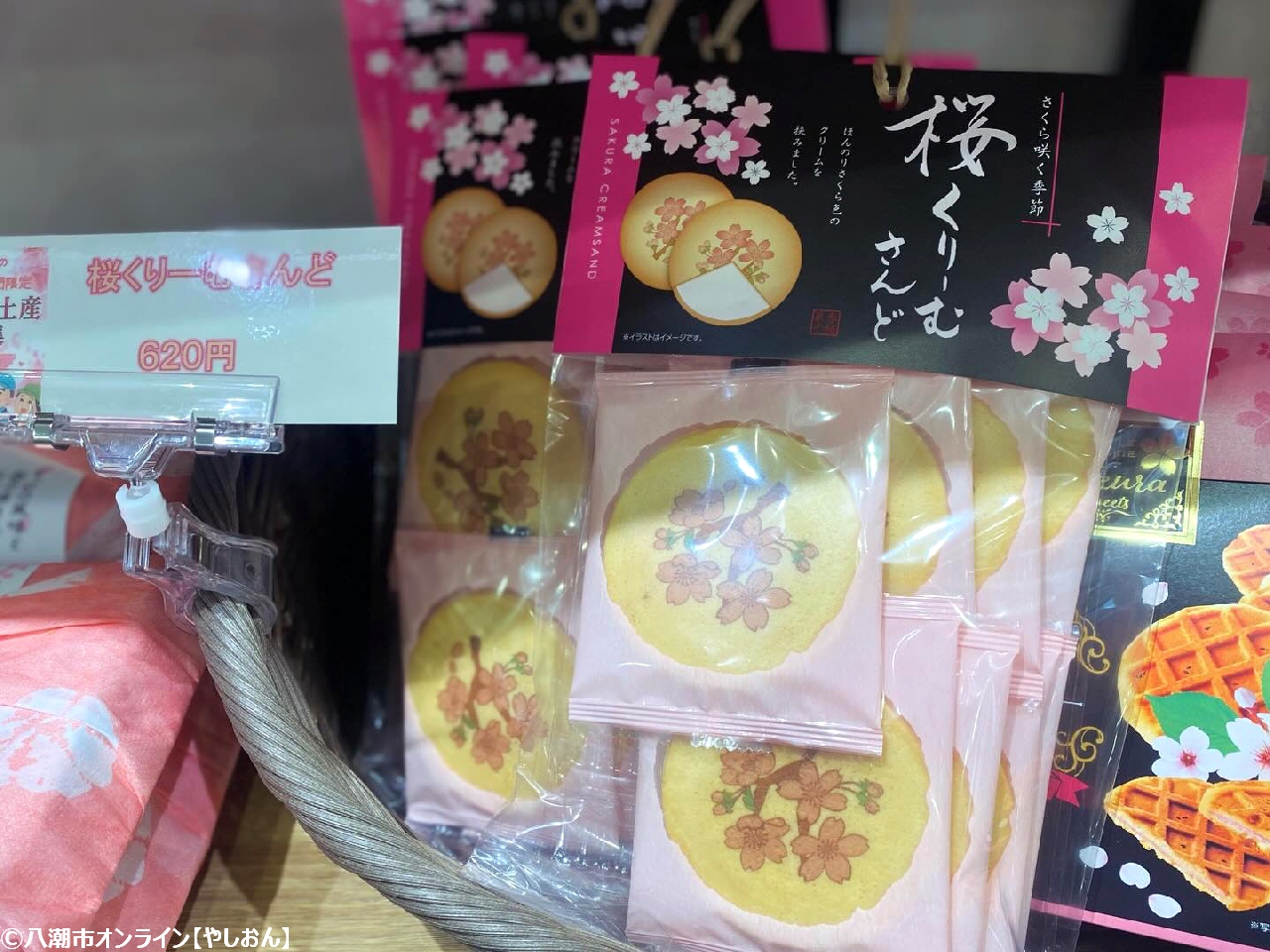 並んでいるのは、桜きんつばや桜あんころり、桜くりーむさんど、桜ワッフルクッキー、桜ようかんなど、見た目も味わいも春らしい限定商品。ピンク色の箱や花柄の包装が華やかで、手に取るだけで気分が明るくなります。お土産としてはもちろん、自分へのちょっとしたご褒美にもぴったりです。
