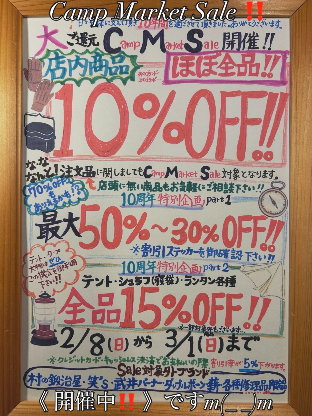 今回の目玉は、店内商品“ほぼ全品”10%OFF。セール対象外ブランドを除き、割引シールが貼られていない商品も対象になるとのことです(※但し現金以外での支払いは5%OFF)。期間は3月1日(日)まで。春のキャンプシーズンを前に、装備を見直す絶好のタイミングです。