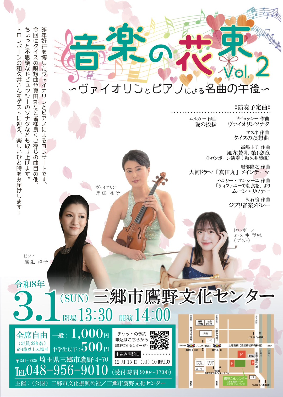 ヴァイオリンとピアノによる名曲コンサート。クラシックから親しみやすいドラマ音楽まで、春の午後にぴったりのプログラムです。