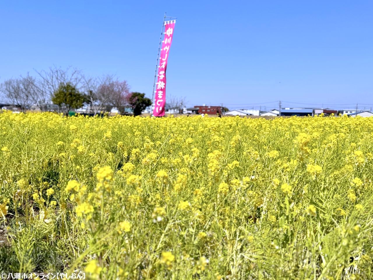 会場となる中川やしおフラワーパークでは、やわらかなピンク色の花桃が咲き始め、あたり一面に広がる約10万本の菜の花が黄色いじゅうたんのように広がります。空の青、菜の花の黄、花桃の桃色。そのコントラストは、思わず足を止めて写真を撮りたくなる美しさです。