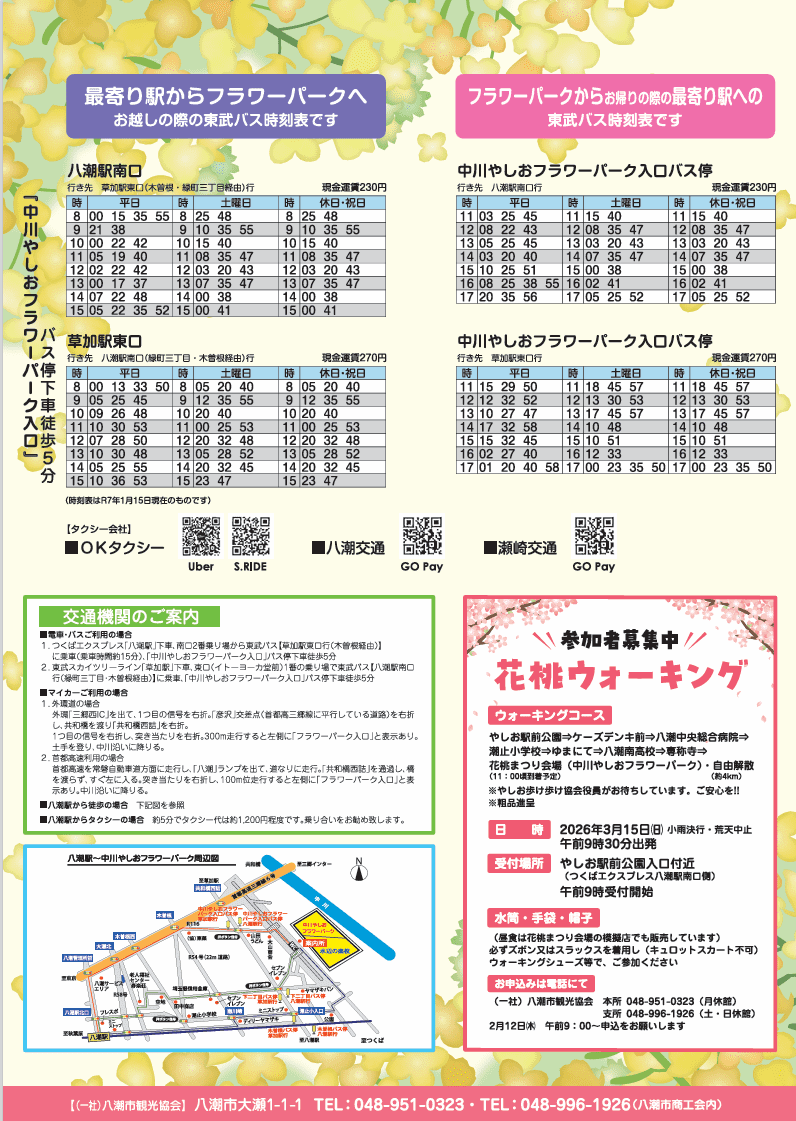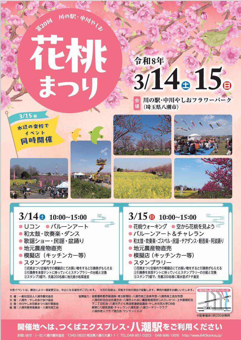 春の訪れを告げる恒例イベント「川の駅・中川やしおフラワーパーク 花桃まつり」が、3月14日(土)・15日(日)の2日間、開催されます。昨年は市内で発生した道路陥没事故の影響により中止となりましたが、今年は第20回の節目として、あらためて春のにぎわいが戻ってきます。
