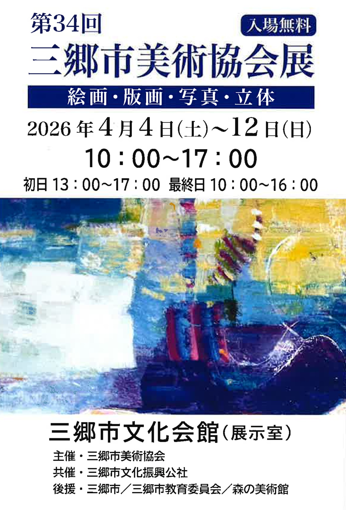 三郷市内の美術愛好家による作品が一堂に会する「第34回三郷市美術協会展」が、2026年4月4日(土)から12日(日)まで開催されます。会場は三郷市文化会館展示室。入場は無料で、気軽に芸術に触れられる機会として毎年親しまれている催しです。