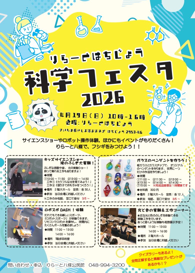 ロボット体験やサイエンスショー、ガラス工作など、子どもから大人まで楽しめる体験型イベント。親子での参加にぴったりです。