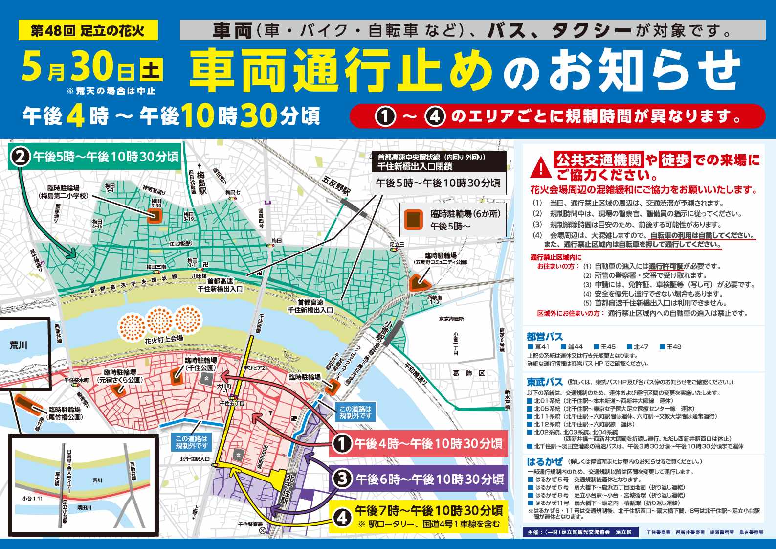 会場周辺は例年大変混雑するため、主催者は分散来場・分散退場への協力を呼びかけています。特に北千住駅周辺は混み合いやすく、西新井側での観覧や東武スカイツリーライン西新井駅利用もおすすめとされています。