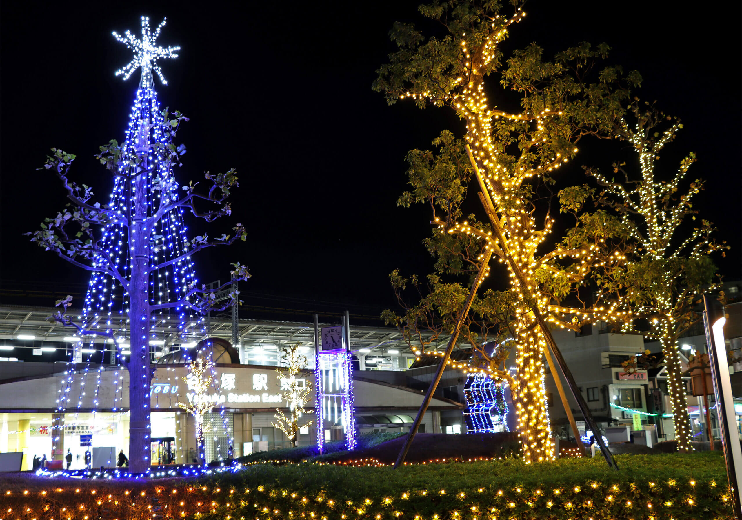 駅前の木々が美しく装飾され、通勤・通学帰りの人々の心を癒やします。静かに冬の夜景を楽しみたい方に向いています。