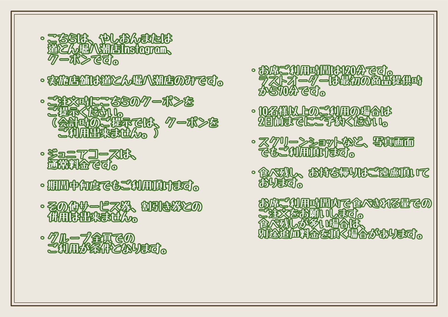 「やしおん」各SNSと「道とん堀八潮店」のInstagram限定提示で1,800円に割引 2025年11月15日まで