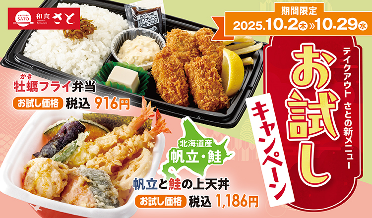 和食ファミリーレストラン「和食さと」を運営するサトフードサービス株式会社(SRSホールディングスグループ)は、秋冬の新メニューをお得に楽しめる「新メニューお試しキャンペーン」を2025年10月2日(木)から10月29日(水)までの期間限定で開催しています。