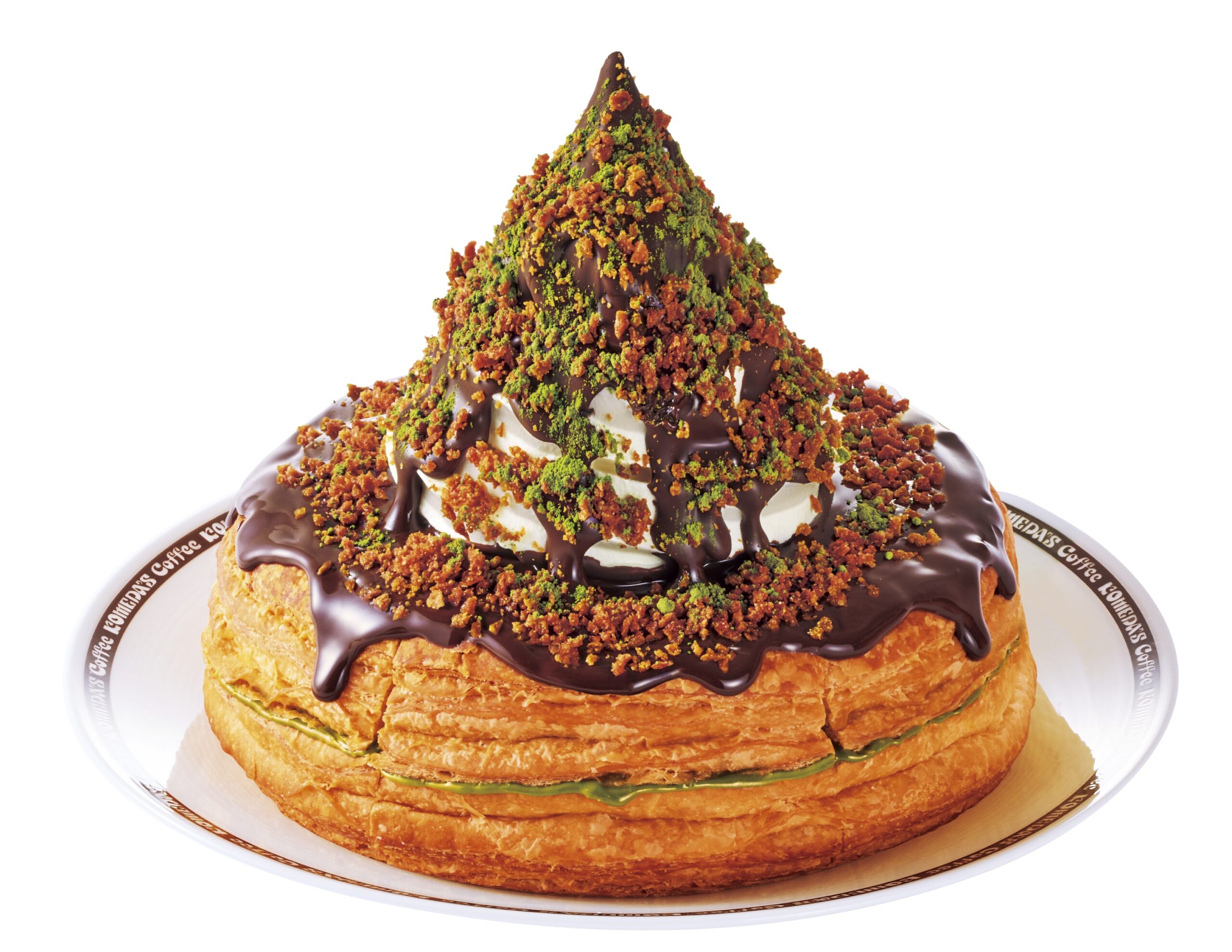 まず注目は、コメダの看板デザート「シロノワール」とのコラボレーションによる「シロノワール ブラックモンブラン ー宇治抹茶仕立てー」(税込970円〜1,030円/ミニサイズ770円〜830円)。ソフトクリームの上でパリッと固まるチョコソースと、ブラックモンブランを思わせるザクザクとしたクランチが特長です。祇園辻利の宇治抹茶を加えることで、ほろ苦さと上品な香りが広がり、温かいデニッシュとの絶妙なコントラストを楽しめます。