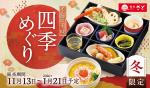 目玉メニューの「四季めぐり膳(かにいくらちらし)」(税込2,198円)は、紅ずわいがにといくらのちらし寿司に、あわびの刺身やごま豆腐などを添えた贅沢な内容。また、「かにいくらちらしとかにあんかけうどん膳」(税込1,758円)は、かにと鴨団子の旨みが広がるあんかけうどんとちらし寿司のセットで、冬の味覚を温かく堪能できます。