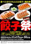 株式会社大阪王将(東京ヘッドオフィス:東京都品川区、代表取締役社長:文野幸司)が展開する餃子専門店「大阪王将」は、2025年11月17日(月)から30日(日)まで、全国の店舗で毎年恒例の「餃子祭」を開催いたします。期間中は、対象の餃子を1人前注文するごとに「餃子1人前無料券」が1枚必ずもらえる、お得なキャンペーンとなっています。