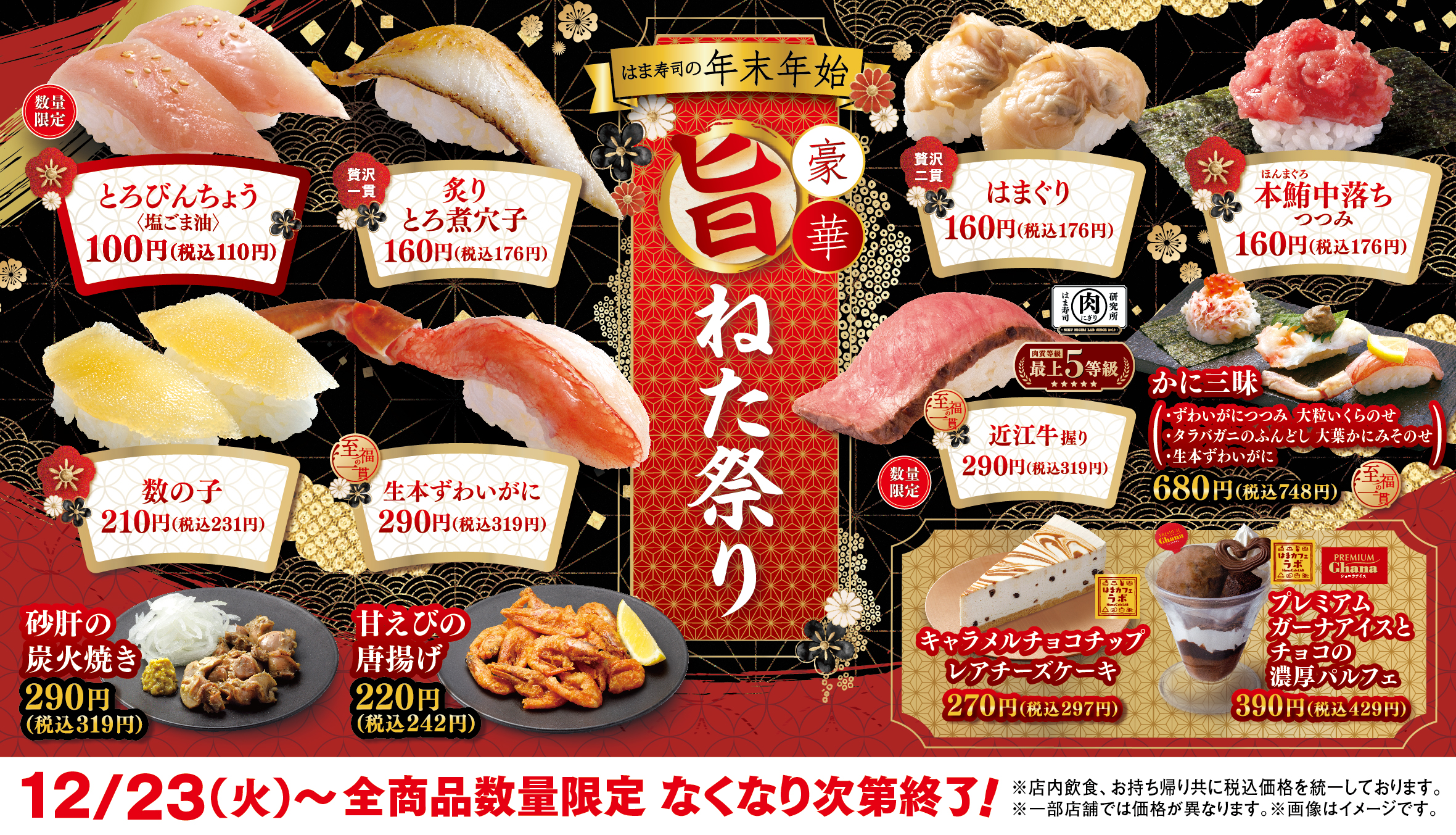100円寿司チェーンのはま寿司は、12月23日(火)より、全国の店舗にて「はま寿司の年末年始豪華旨ねた祭り」を開催しています。本フェアは、年末年始の特別企画として、定番から豪華食材まで幅広い“旨ねた”をお手頃価格で楽しめる内容となっています。