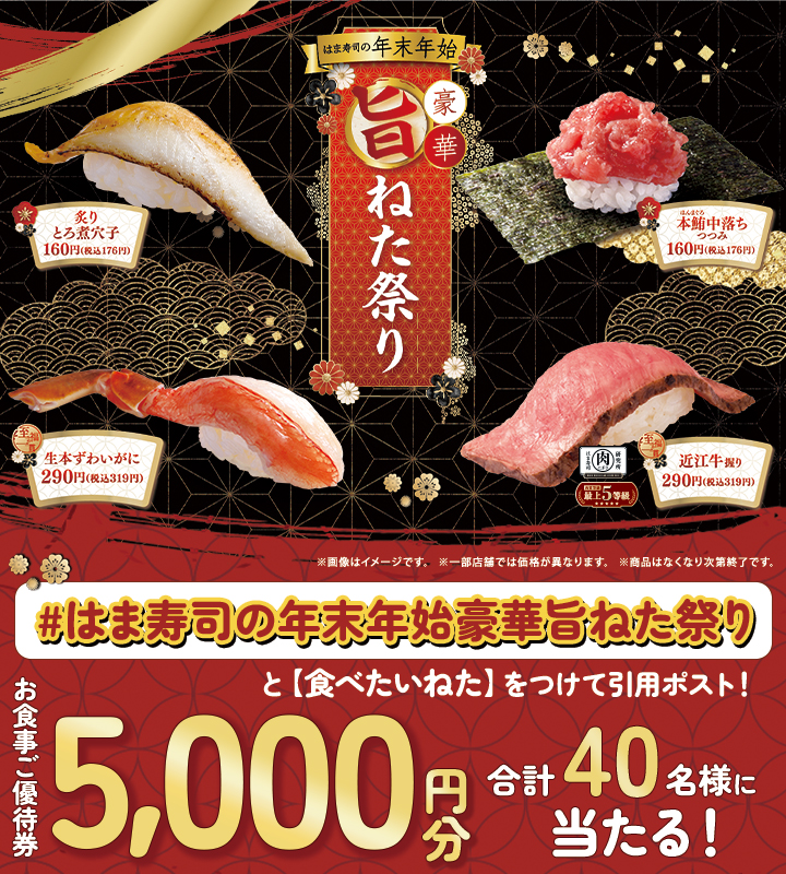 さらに、はま寿司公式Xではフェア開催を記念し、抽選で合計40名にお食事ご優待券5,000円分が当たるキャンペーンも実施されています。応募期間は12月22日(月)10時30分から12月24日(水)23時59分までとなっています。