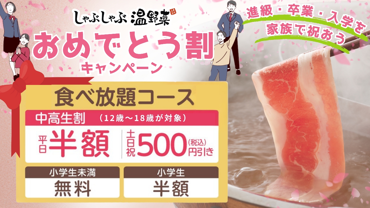 進級や卒業、入学など、家族にとって節目となる行事が重なる春。そんな季節に合わせて、しゃぶしゃぶ温野菜が、中高生を対象にした期間限定の割引キャンペーンを実施します。