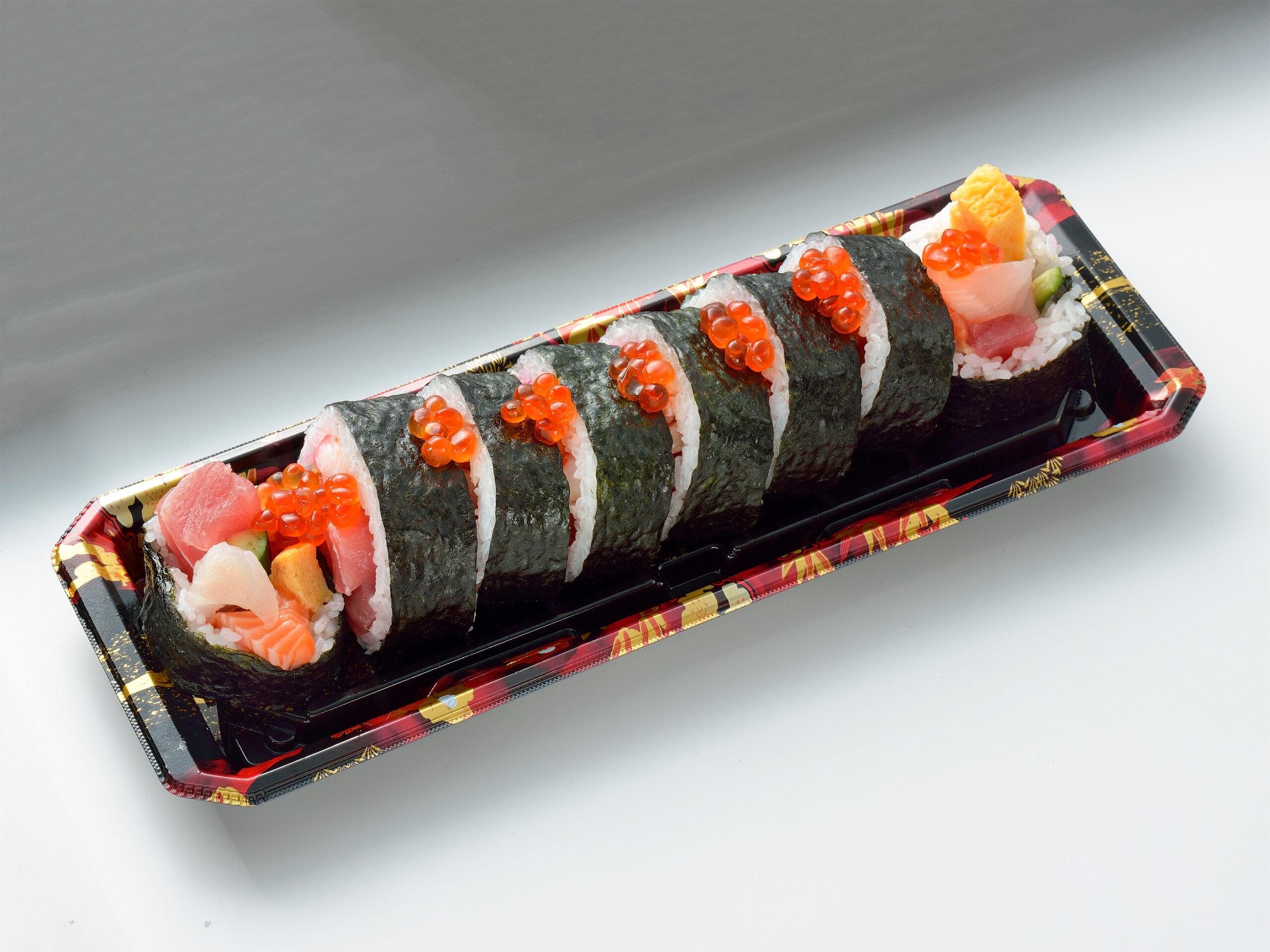 まぐろや真鯛、いくら、煮穴子などをたっぷり巻き込んだ太巻きタイプ。一本でしっかり海鮮を堪能できるため、家族で取り分けるのにもぴったりです。