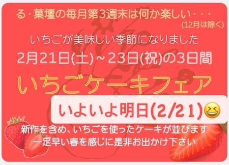 八潮市中央にある洋菓子店「る・菓壇」で、いちごが主役の「いちごケーキフェア」が2月21日(土)から23日(祝)までの3日間限定で開催されます。