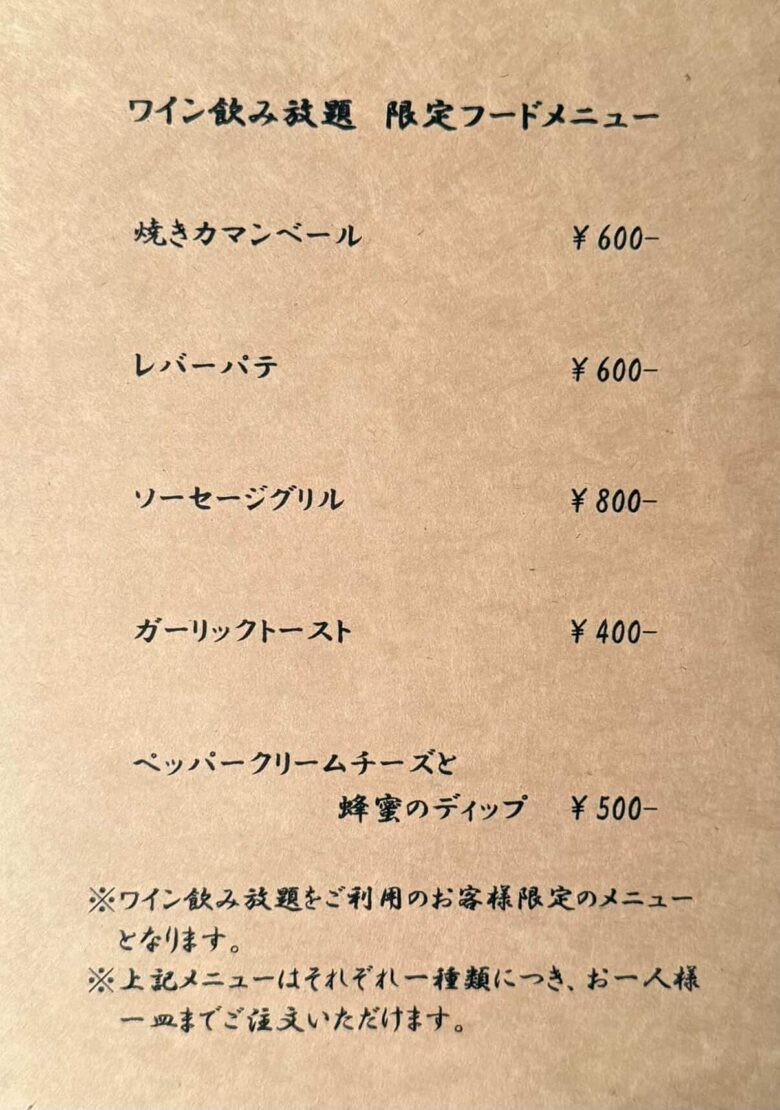 今回の目玉は、なんといってもワインの飲み放題。対象となるのは、InstagramまたはX(旧Twitter)をフォローした方で、1時間1,000円という手頃な価格でワインを楽しむことができます。さらに、延長も可能とのことで、ゆったりとした時間を過ごしたい方にも嬉しい内容です。