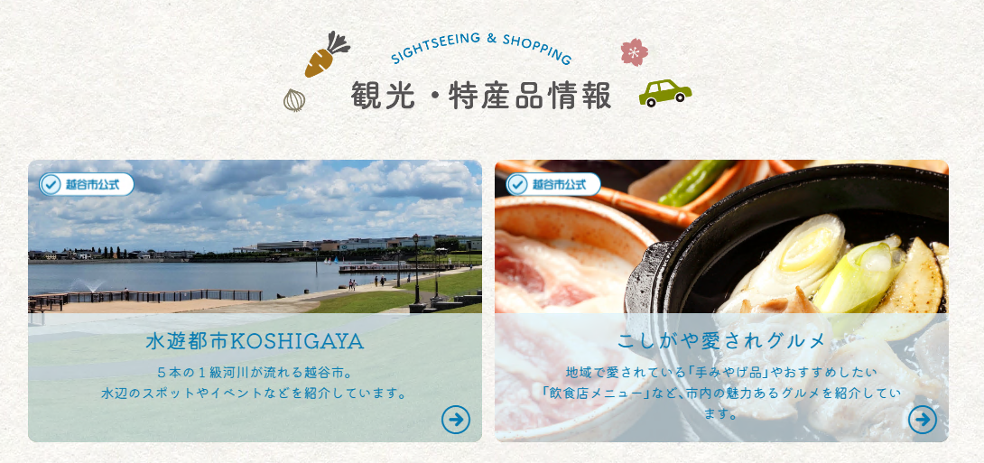 越谷市独自のコンテンツも充実。「水遊都市KOSHIGAYA」では、水辺を活かした観光・文化スポットを紹介し、「こしがや愛されグルメ」では、地元で愛される名物や人気メニューをマップ付きで発信。地域の人たちの“好き”が形になる、まちぐるみのプロモーションが展開されています。