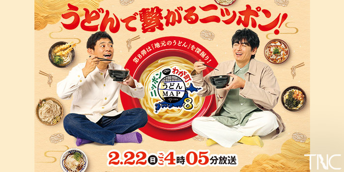 福岡発・テレビ西日本制作、フジテレビ系列全国28局ネットで放送される『ニッポンわが町うどんMAP8』の収録が、同店で行われたようです。MCを務めるのはおなじみの博多華丸・大吉さん。スタジオゲストとしてケンドーコバヤシさん、福岡県出身の井桁弘恵さんも登場し、うどん尽くしの75分を盛り上げます。