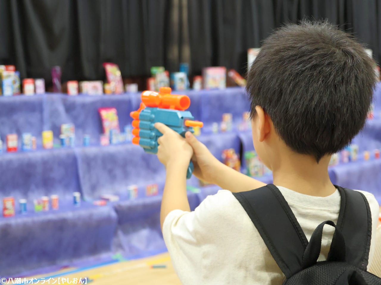 体育館では射的コーナーが大盛況。開始前から行列ができるほどの賑わいを見せ、景品を手にした子どもたちは満面の笑みを浮かべていました。