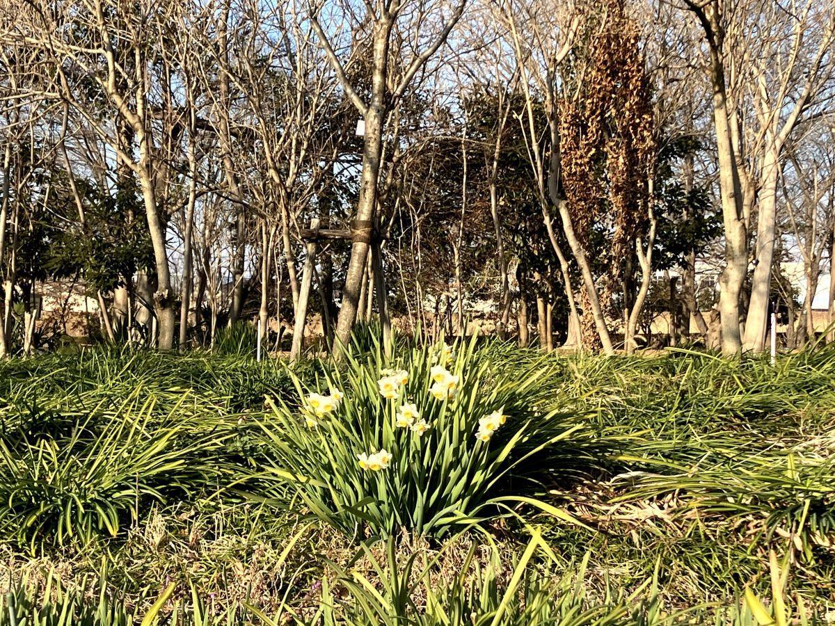 1月の花桃園のわきに白い房咲き水仙が可憐な姿でたたずんでいました。
