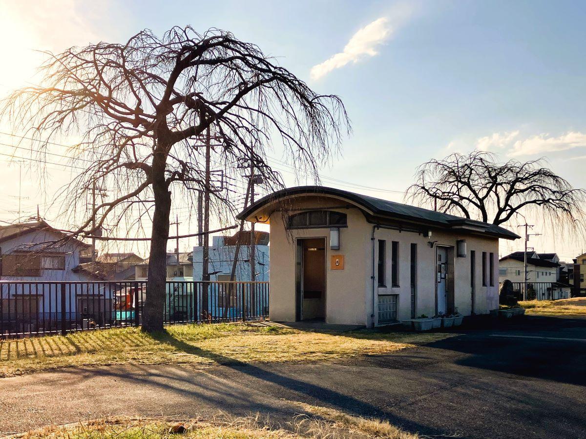 堤防の上の「水洗トイレ」と「しだれ桜」