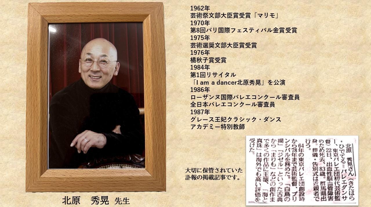 浜中先生は22歳になった大学卒業の年まで、チャイコフスキー記念東京バレエ団で踊っておられました。このバレエ団はボリショイのダンサーなどを招いて、本物のバレエを日本でも見せようとするバレエ団で、北原先生が初代の芸術監督でした。