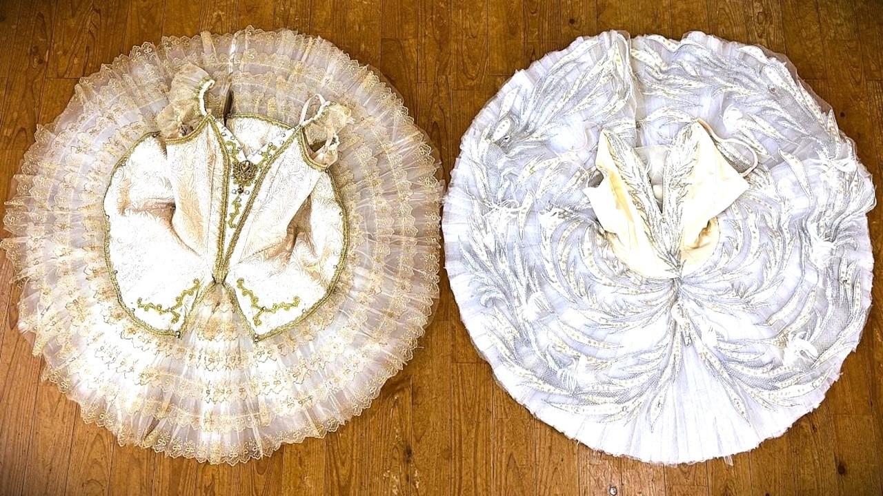 こんなにも豪華な手仕事の衣装。右側のオデットのチュチュはロシア製! 浜中先生が20年前に踊った時の物で、相手の王子役は当時パリオペラ座のダンサーだったピエール。
