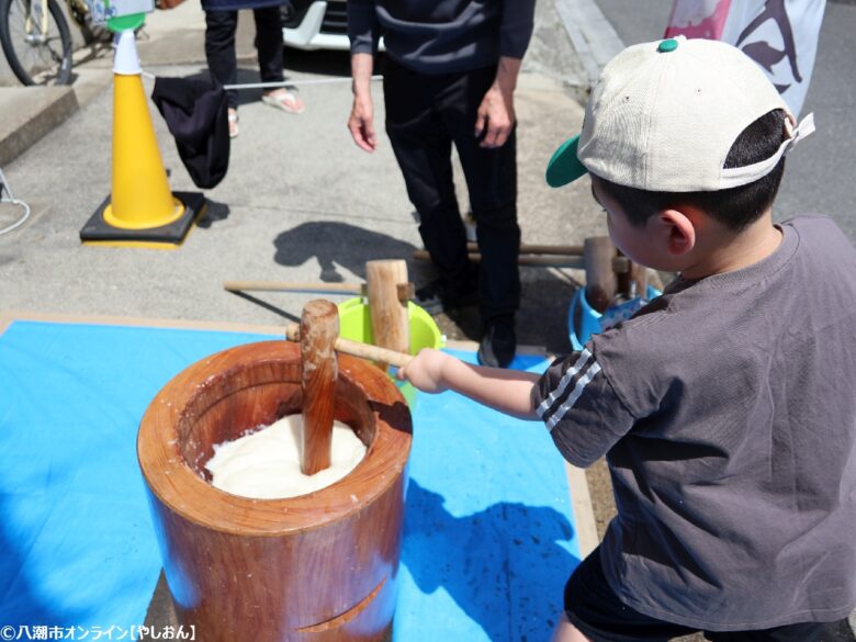 当日は午前11時からスタートし、店頭ではつきたてのお餅とかき氷が無料で振る舞われました。杵と臼でついたばかりのお餅は、やわらかく香り豊かで、この日ならではの特別な味わい。家族連れや近隣の常連客が笑顔で列をつくり、出来たての味を楽しむ姿が印象的でした。